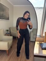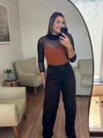 Possui modelagem que valoriza o corpo, recortes frontais que alongam a silhueta e dão um toque fashionista à peça.